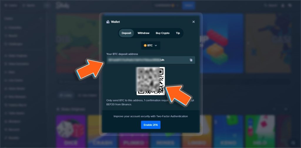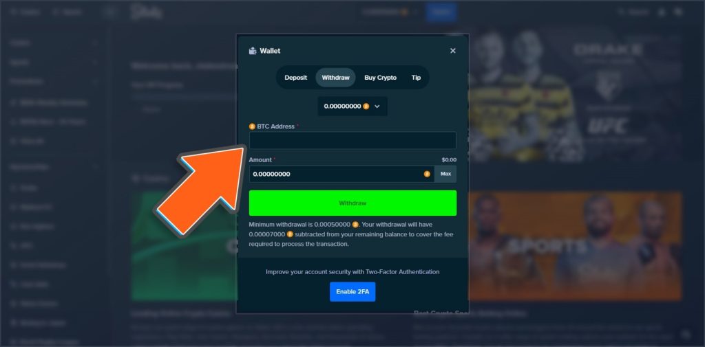 การถอนเงินจะแตกต่างจากการฝากเงินเล็กน้อยตรงที่ต้องทำการกรอกที่อยู่ BTC เพื่อทำการถอนให้ไปถึงอีกกระเป๋าเงินของผู้เล่น เพื่อเริ่มต้นการถอนอันดับแรกให้กดที่ปุ่ม Wallet ที่ด้านบนสุดตรงกลางจอ